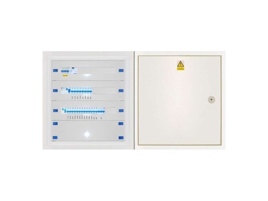 Domovní instalační rozvaděč do vnitřního prostředí osazený jističi a dalšími komponentami. Je vhodný pro rodinný dům nebo byt o velikosti 5+1 střední vybavenosti s plynovým vytápěním a kombinovaným sporákem.